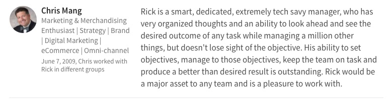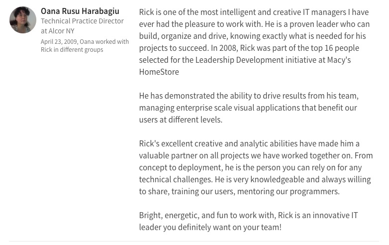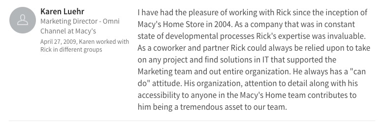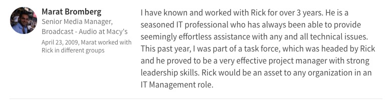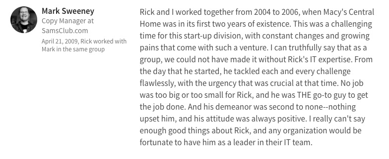 With my foundation in IT infrastructure, software engineering, support and eCommerce, I currently specialize in: software engineering (SDLC), IT infrastructure and cloud migration. I’ve mastered working with highly technical project teams, business partners, functional teams, vendors, independent contractors and executives to plan, manage & deliver quality work within an optimal schedule.